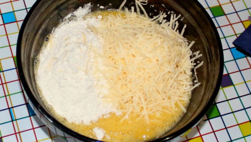 - Для кляра сыр натрите на терке с мелкими отверстиями, добавьте яйца, мускатный орех, муку. Тщательно перемешайте массу до однородности. Если нужно, подсыпьте муки, чтобы консистенция была гуще.