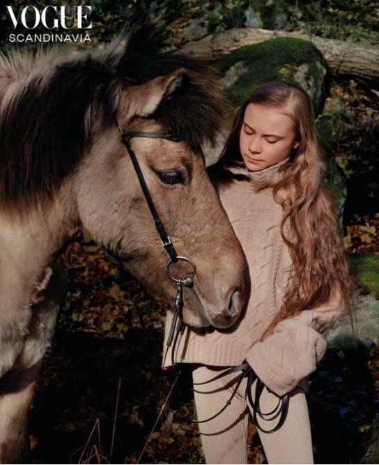 И вот совсем недавно Грета снова начала мелькать на обложках. Журнал Vogue Scandinavia поместил фотографию Греты, которая сидит в лесу и гладит своего коня Стренгура. В таблоиде вышла статья, в которой девушка обвиняет индустрию моды в том, что именно благодаря этой сфере жизни экология ухудшается особенно сильно.