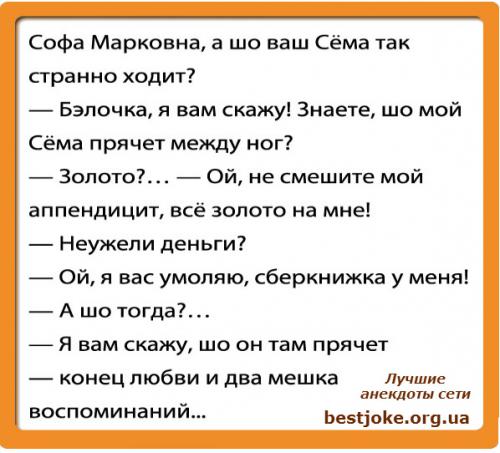 У еврейского юмора есть свой уникальный характер и шарм, и благодаря этому к него есть масса поклонников и почитателей. Для всех ценителей анекдотов с атмосферой Израиля или Одессы — новая подборочка юмора в этом стиле. Наслаждайтесь!