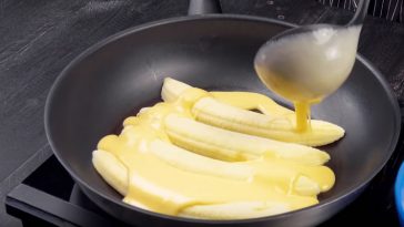 Кладем фрукты на сковороду и заливаем тестом. Эти блины — просто чудо!