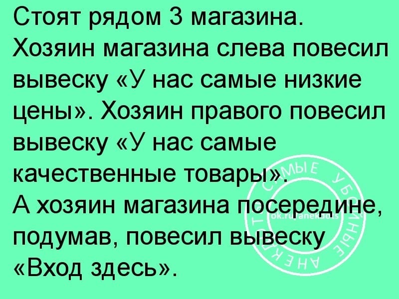Умение продавать товары — залог к успеху современного человека. Очень многие устраиваются на работу «продажников» в разнообразные фирмы, но далеко не каждый становится успешным менеджером в этой сфере. Говорят, для этого, помимо навыков и знаний, который можно приобрести, нужны еще врожденные таланты и удача. Ну и высочайший уровень напористости, стрессоустойчивости и настойчивости. И последнего качества у героя нашего первого анекдота — более чем достаточно!