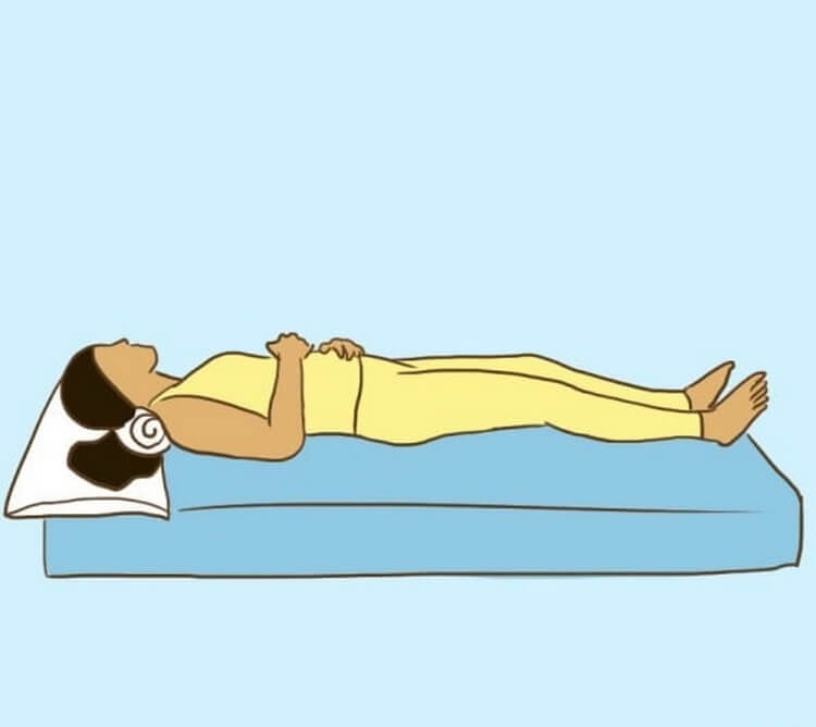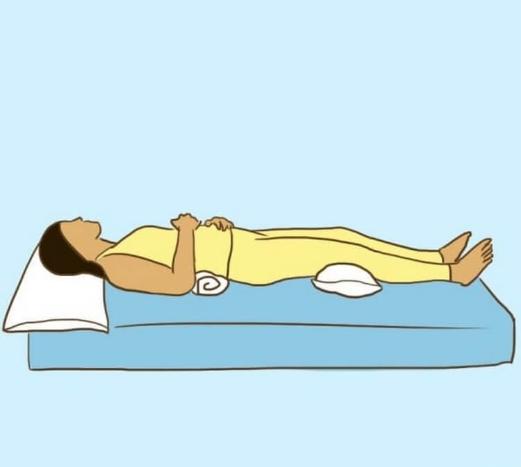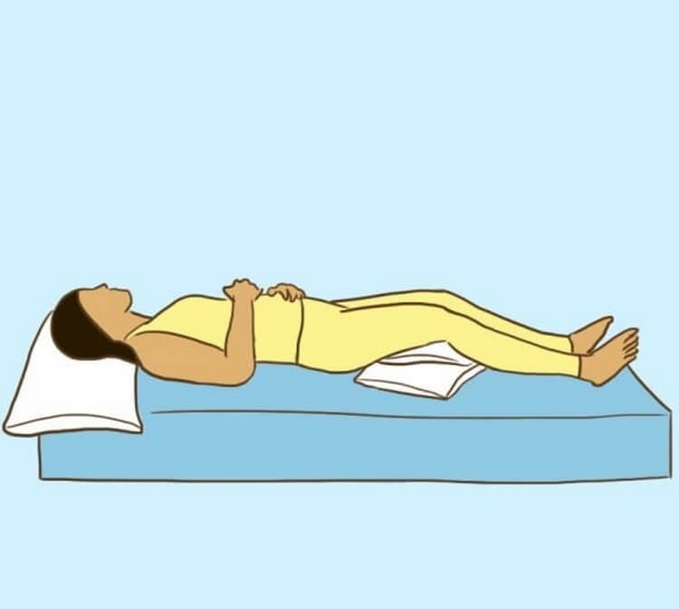 «Лягте на спину и положите подушку под колени. Еще можно положить маленькое свернутое полотенце под изгиб вашей спины».