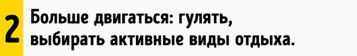 С возрастом метаболизм замедляется, и поэтому мы незаметно, но неумолимо набираем вес. Чтобы не давать лишним килограммам шанса, нужно сохранять активность. Не стоит изнурять себя тренировками, если это не доставляет вам радости (а если доставляет — мы за вас очень рады!). Физическая активность должна стать частью жизни. Например, в выходные можно выбраться на прогулку в лес, зимой — поиграть в снежки, а летом — отправиться в поход на озеро.