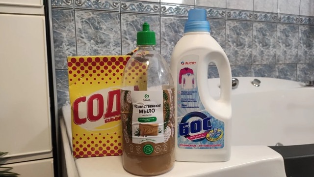 Я решил попробовать этот метод отбеливания, который включал в себя соду кальцинированную, жидкое хозяйственное мыло и отбеливатель БОС.