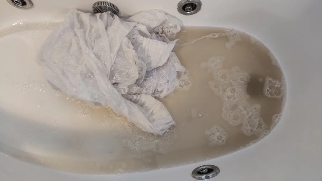 Я периодически переворачивал шторы в растворе, и уже через полчаса можно было видеть, как грязь начинает отделяться.