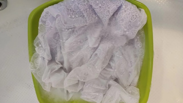 1. Сначала я приготовил раствор из мыла и соды в пропорции 1:1. Затем шторы полностью погрузил в этот раствор и оставил на несколько часов, пока занимался другими делами.