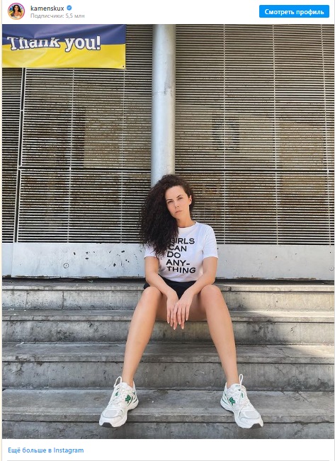 На фото Каменских позирует сидя на ступеньках с разведёнными ногами, как первая леди для фотосессии американского фотографа Энни Лейбовиц. Из одежды на Насте была футболка с надписью «Девушки могут делать что угодно», мини-шорты и белые кроссовки.