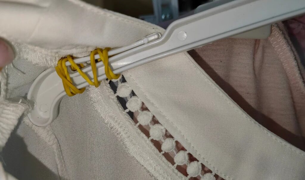 Пластиковые вешалки в моём шкафу часто служат причиной скольжения одежды, но я нашла решение: обмотать концы вешалок резинками для обеспечения надёжного сцепления.