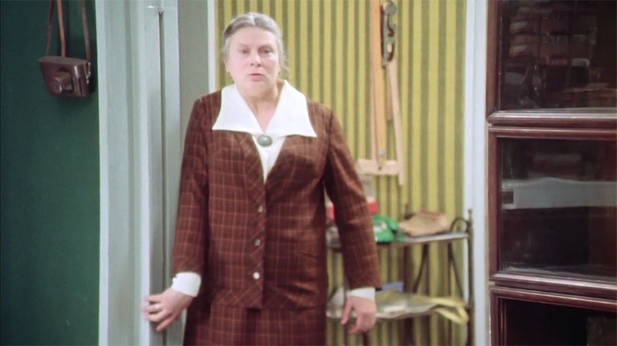 Тоже не сходится — мама, как видите одета в коричневый клетчатый костюм, а призрак у за спиной у Ипполита в черную юбку и какую-то зеленоватую кофту.
