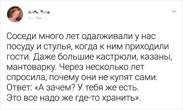 Была у меня одна соседушка. Одолжила она как-то у меня сковороду чугунную, немаленькую, мол, картошку на всю свою семью пожарить хочет. Я дала. Проходит несколько дней, иду за сковородой, а она мне заявляет: «Отдай ее мне, у меня ж семья большая, а вас всего 4 человека. Зачем тебе она?!» © Nati Nati / Facebook