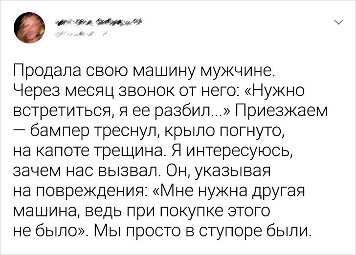 Я как-то продавал на онлайн-барахолке запчасти от своей машины. Один парень прицепился, мол, продай это и это за полцены. Где-то месяц забрасывал своими просьбами, писал, что на шее дети и жена беременная, кредиты, новые запчасти купить не может, а старую тачку срочно надо в ремонт, чтобы таксовать и кормить семью.