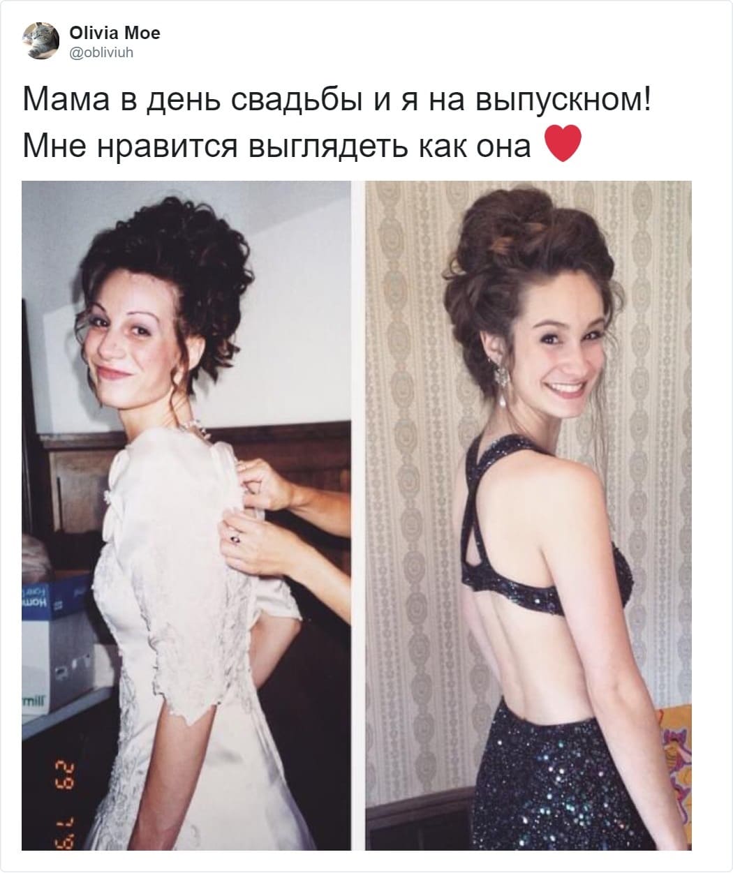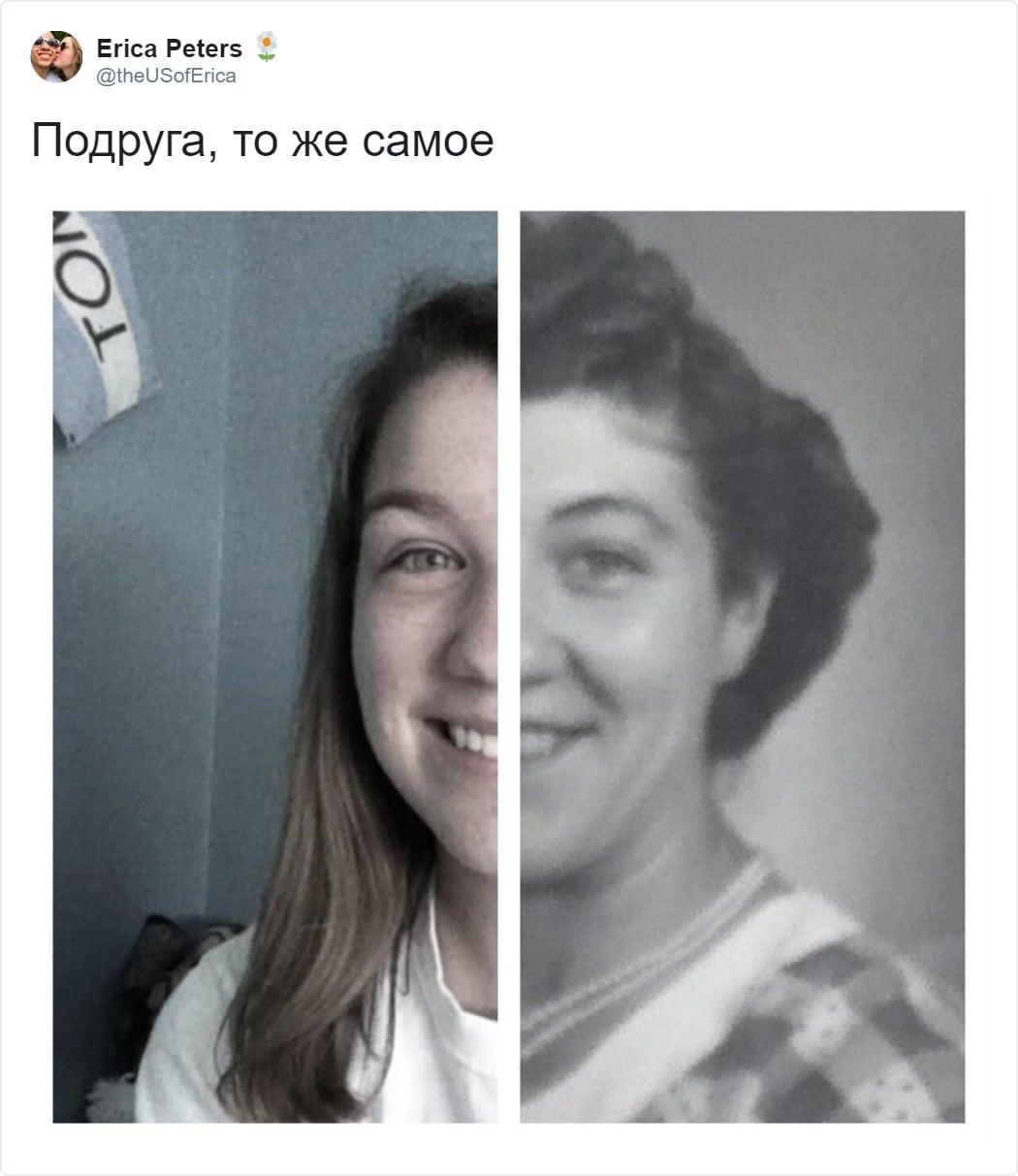 Недавно с сети начался своего рода флешмоб. И заключается он в том, чтобы делится своими фото, где очевидно фото с родственниками. А запустила эту волну девушка, когда выставила два кадра – на одном её бабушка, а на втором – она сама. И их сходство просто поразило пользователей интернета. Вместе с тем, они начали выставлять свои фото. И вскоре оказалась, что такие случаи есть, и они не редкость. Просто в повседневной жизни мы не всегда их замечаем.