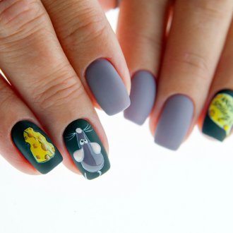 Есть оригинальные идеи как задобрить Крыску, не прибегая к белому и металлическому цветам — это тематические рисунки. Вряд ли такой маникюр подойдет к роскошному вечернему платью, но для домашней вечеринки — то, что надо.