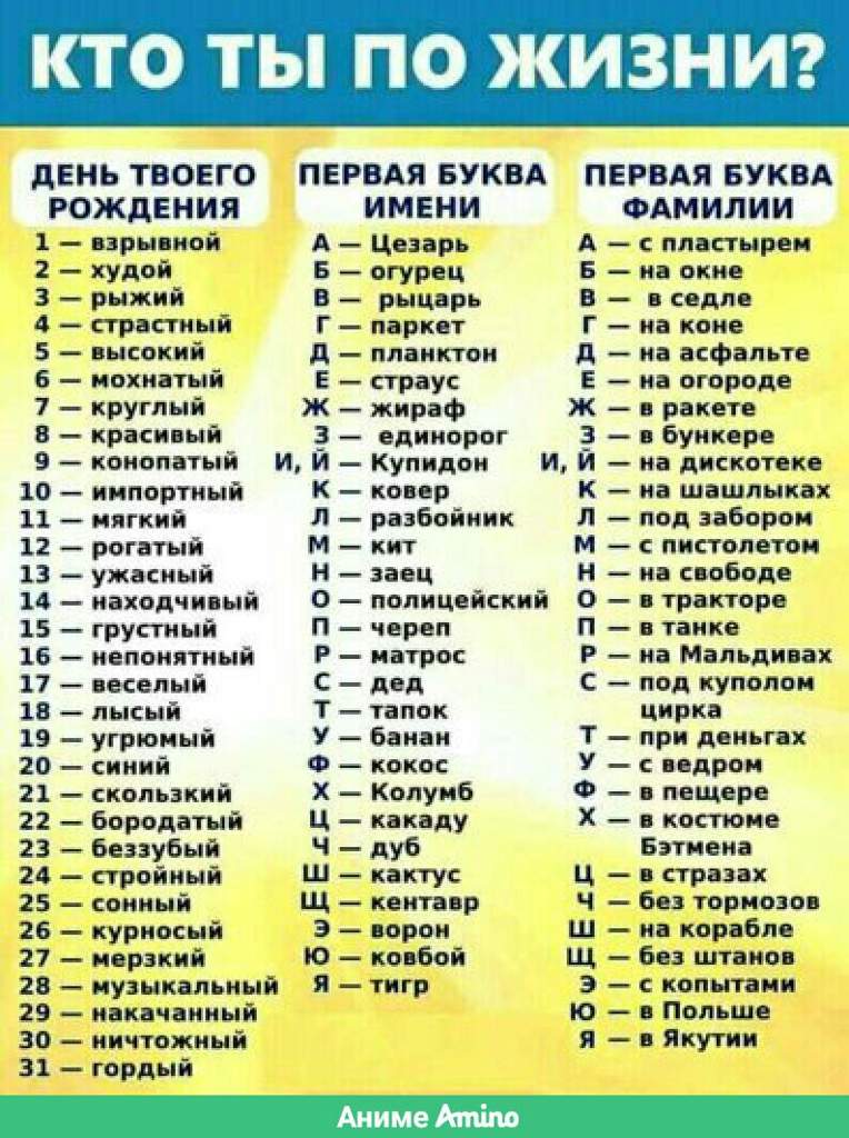 Среди вечной суеты, круговорота забот и хлопот, порой стоит расслабиться и малость пошалить. Предлагаем Вам милое минутное развлечение, которое гарантированно Вас повеселит. Определите кто Вы согласно таблице по дате рождения и первым буквам имени и фамилии.