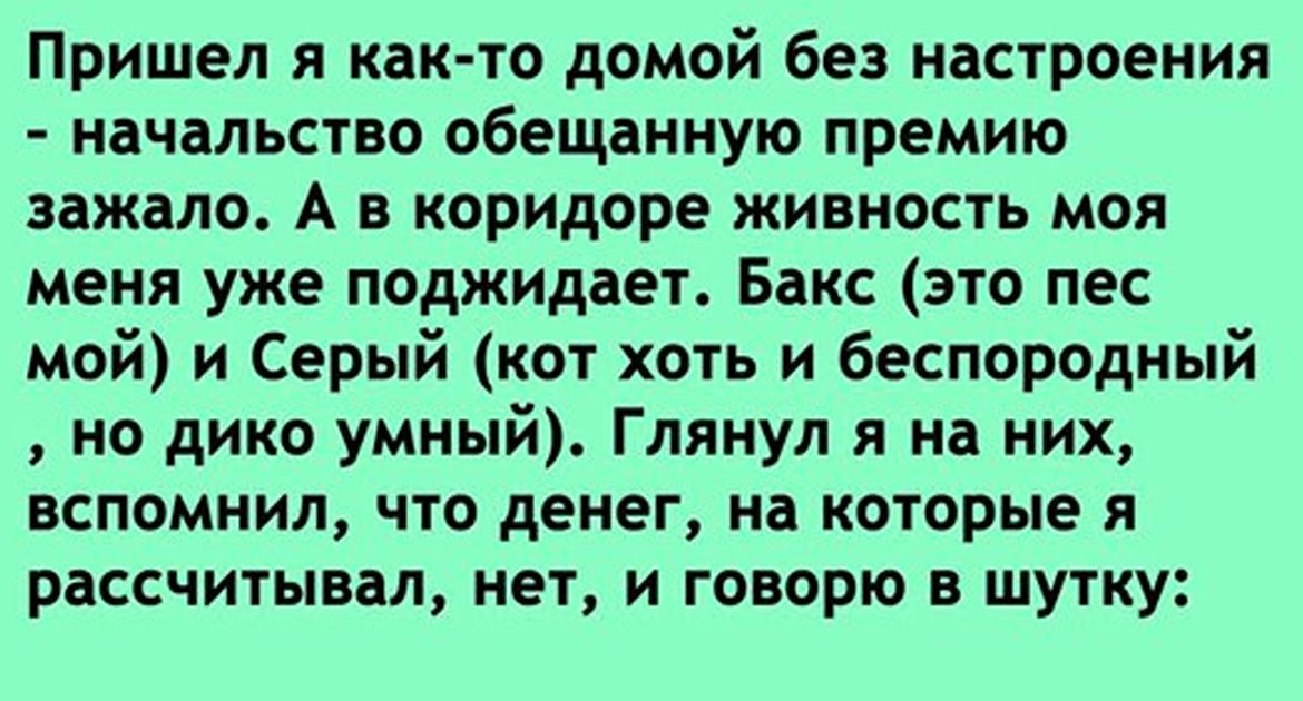 Пришел я как-то домой без настроения – начальство обещанную премию зажало. А в коридоре живность моя меня уже поджидает. Бакс (это пес мой) и Серый (кот хоть и беспородный, но дико умный). Глянул я на них, вспомнил, что денег, на которые я рассчитывал, нет, и говорю в шутку: