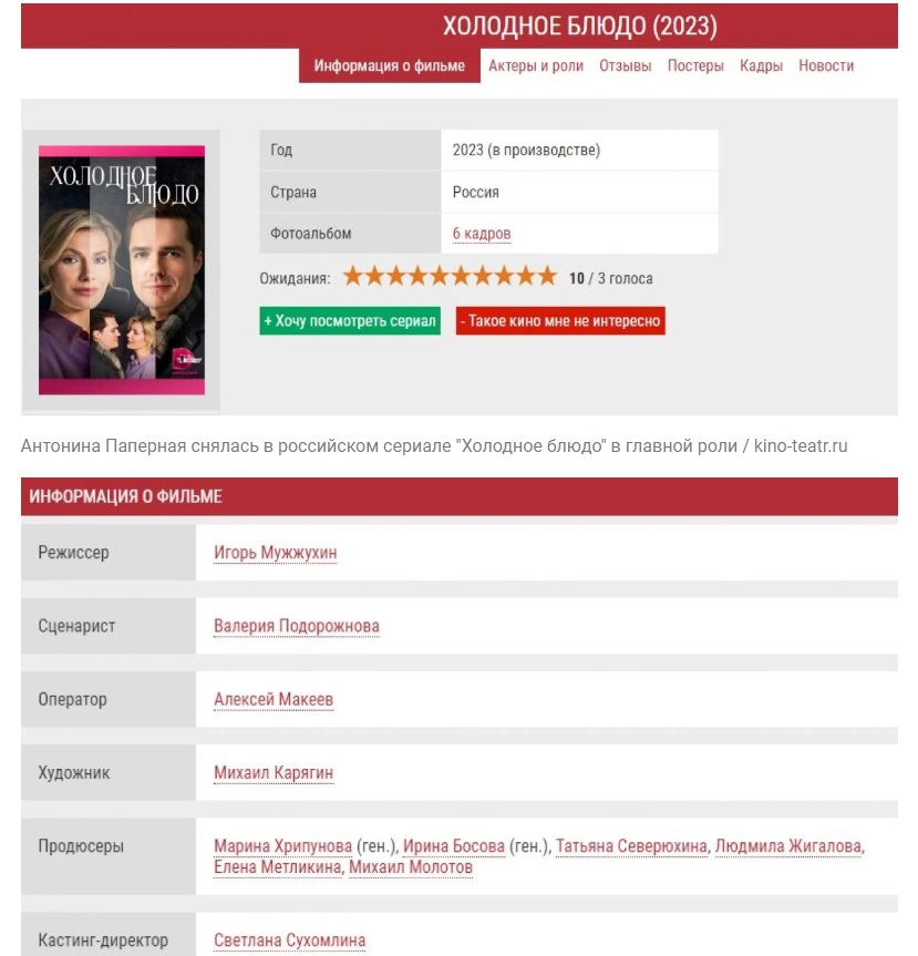 Картина под названием «Холодное блюдо» выйдет на экраны рф уже этой осенью. Сериал о девушке Дане (Паперная), которая по странному стечению обстоятельств оказывается втянута в закрученную любовную историю.