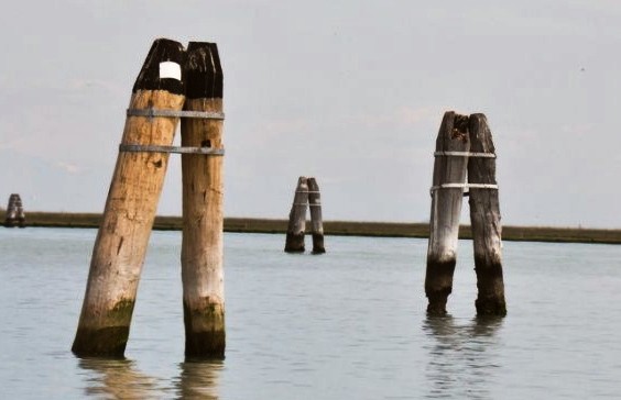 Навигационные указатели, брикколы, в Венецианской лагуне: на правом хорошо видно, что морская вода делает с деревом.