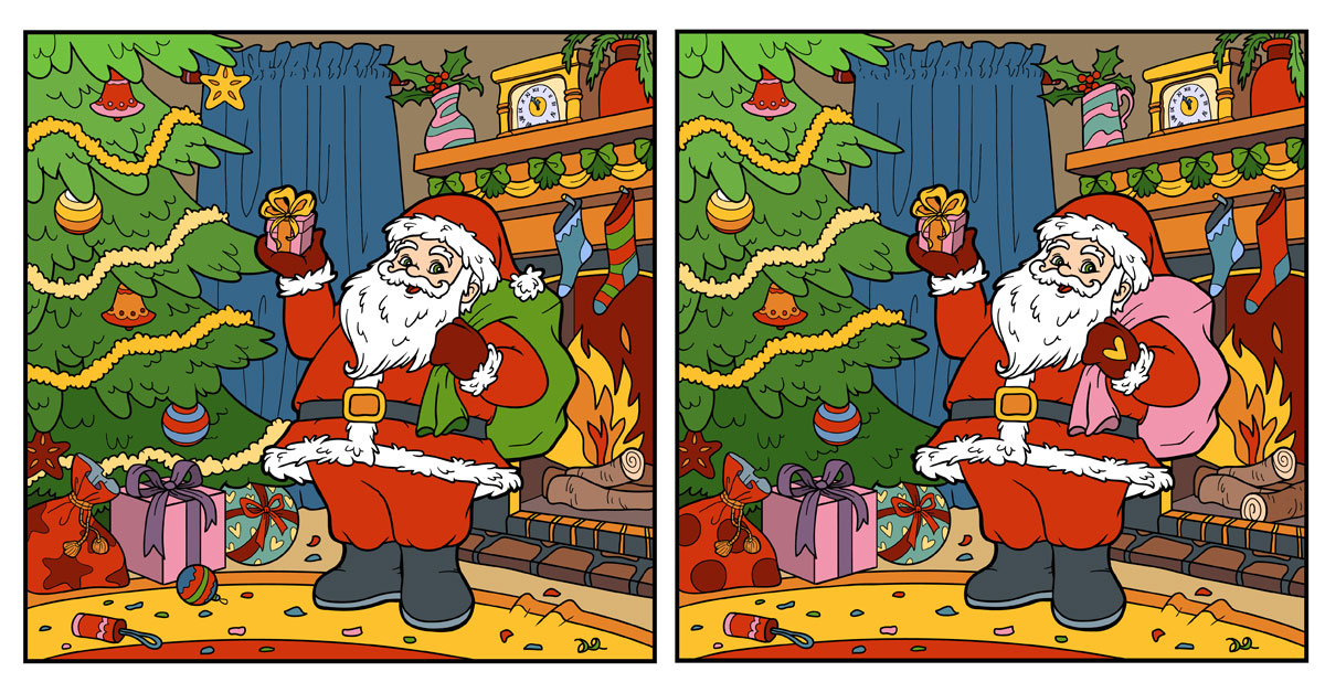 И вы, верно, уже подметили, что некоторые отличия так и просятся найтись первыми. Безусловно, речь идет о рукавице Санты. Ведь если слева она изображена без рисунка, то справа на ней уже имеется сердечко. Да что уж говорить, даже мешок волшебным образом поменял свой цвет с зеленого на фиолетовый. Кстати, а какая еще деталь не вписывается в картину?