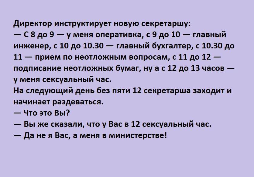 В каждом рабочем дне самое главное — сохранять бодрость духа. Ведь это, в том числе, обеспечивает продуктивность и высокую работоспособность. А уж каким образом вы будете приводить в порядок свое настроение — это уже ваше личное дело. Мы же просто скромно предлагаем нашу лучшую подборку супер-позитивных анекдотов. Только предупреждаем — она настолько смешная, что вы не сможете сдержать улыбки и смеха. Поэтому лучше воздержаться от прочтения в присутствии начальника. Хотя, возможно, он у вас тоже с чувством юмора?