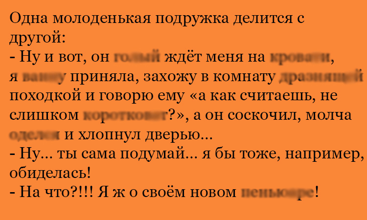 Люди нигде не чувствуют себя так неловко и не бывают такими уязвимыми, как в постели. Отсутствие одежды оголяет не только тело, но и внутренние комплексы человека. И, казалось бы, юмор — отличный способ снять напряжение и добавить расслабленности двум людям, которые решились заняться любовью, но одно неправильно истолкованное слово может довести ситуацию до полного краха… И как раз о таком случае — наш первый анекдот.