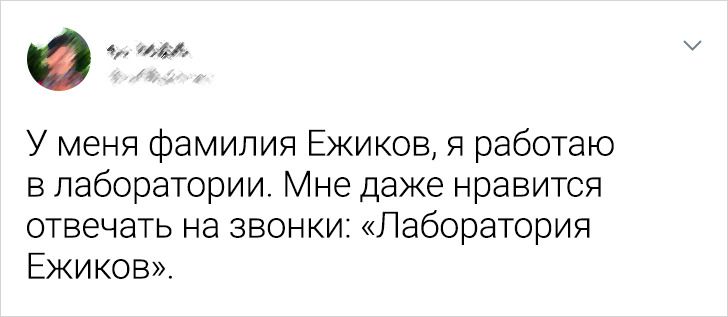 - У нас на работе у тетеньки знаете какая фамилия была? Не знаете? А потому, что секрет. Секрет — это фамилия. И ей совсем не смешно уже, поверьте. Она даже специально говорит, когда спрашивают: «Моя фамилия — Секрет». И все равно люди тупят и уточняют. © stilks / Pikabu