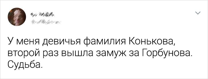 - В университете у меня была одногруппница по фамилии Нужная. На последнем курсе она вышла замуж, избранник оказался Хитрый. Свою фамилию она менять не стала. Но группа по-доброму подтрунивала, что теперь они Хитронужные или Нужнохитрые. © Марина Шупик / Facebook