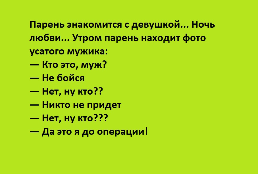 Нельзя просто так взять и пойти, не улыбаясь, на работу. Ведь тогда рискуете прожить этот день серо и уныло. Другое дело, если хоть разок улыбнетесь после пробуждения. Вот тогда все дела пойдут совершенно иначе. И даже если погода не балует вас сегодня своим теплом, всегда можно найти 1000 и 1 повод для улыбки, помимо внешних обстоятельств. Можно, например, открыть нашу утреннюю подборку анекдотов и немного почитать. Как результат — получите заряд позитива, которого хватит на весь день. А если поделитесь им с окружающими — получите еще больше позитива. И тогда день наверняка будет удачным..