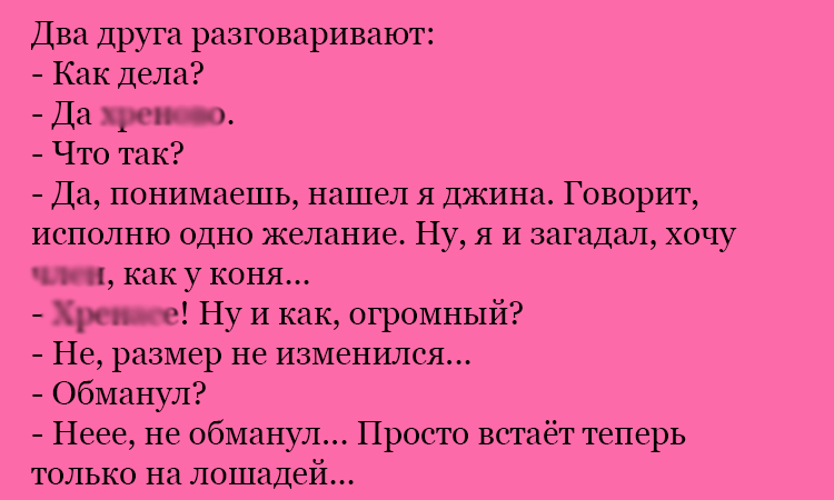 Шуточки про котиков и собачек конечно милые, и могут даже вызвать улыбку, но больше подходят для деток младших классов. Давайте будем честными и признаем — самый смешной юмор тот, который на грани приличия, а порой — и за ней. Но и мы с Вами — взрослые люди, и вполне можем похохотать над взрослыми анекдотами. Так что наслаждайтесь — партия провокационных, смелых и пикантных анекдотов ждет Вас! Развеселого всем настроения!