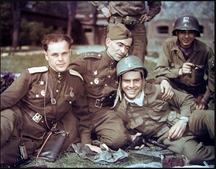 Солдаты США и советские офицеры во время дружеской встречи на Эльбе, апрель 1945.