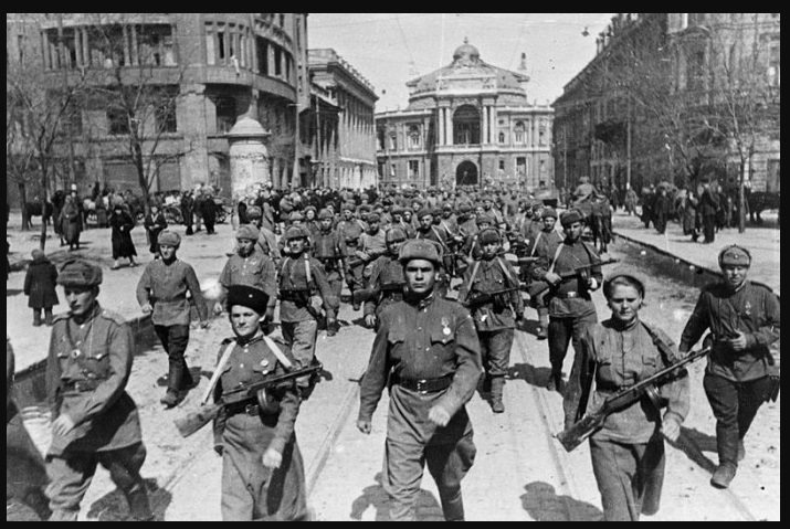 62-я армия, группа солдат, среди них две женщины, марширует по улицам Одессы, апрель 1944 года.