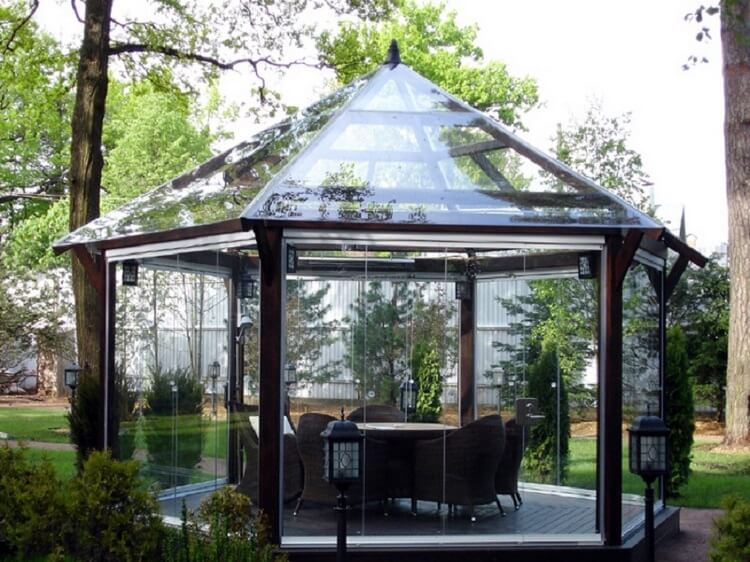 1. Беседка в современном стиле, она из стекла и в форме шестигранника. Такая беседка защитит и от дождя и от ветра. Вечером можно видеть звезды, находясь под защитой стеклянных стен. Креативно и необычно! На жаркое время крышу можно декорировать драпированной тканью.