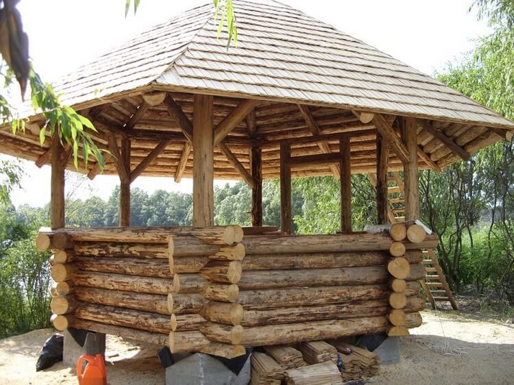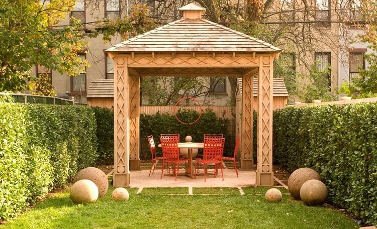 14. Деревянная беседка.Геометрический резной узор, открытое пространство, круглые камни…Настоящее украшение сада.