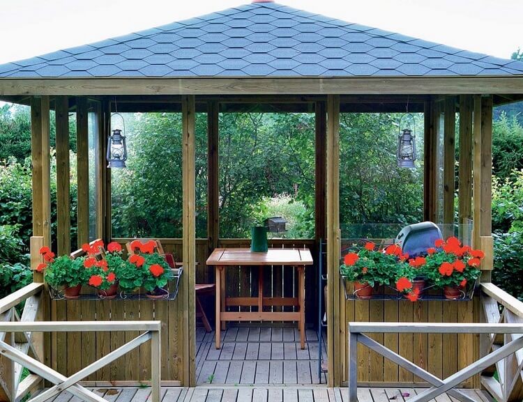 9. Деревянная беседка сложной конструкции. Мягкие диваны, цветы, ковер…Уютно, ярко и светло!