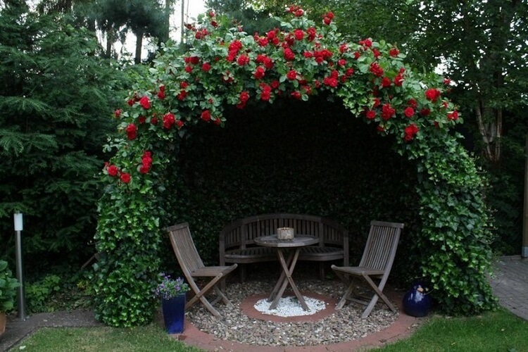 5. Сказочная беседка из цветов и вьющихся растений. Словно сказочный домик с деревянными креслами и лавкой. Уютно, необычно и ярко!