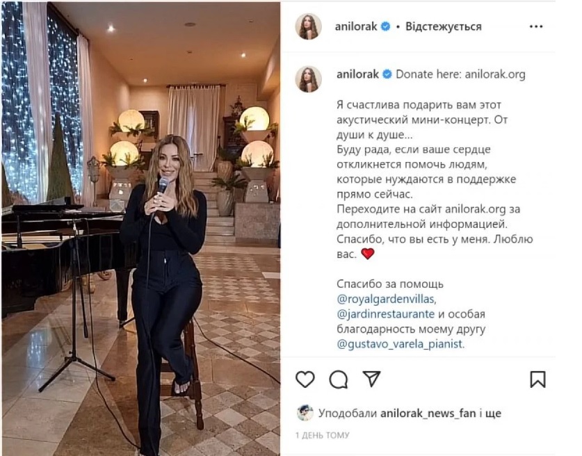 «Я счастлива подарить вам этот акустический мини-концерт. От души к душе… Буду рада, если ваше сердце откликнется помочь людям, которые нуждаются в поддержке прямо сейчас. Переходите на сайт за дополнительной информацией. Спасибо, что вы есть у меня. Люблю вас», — написала исполнительница.