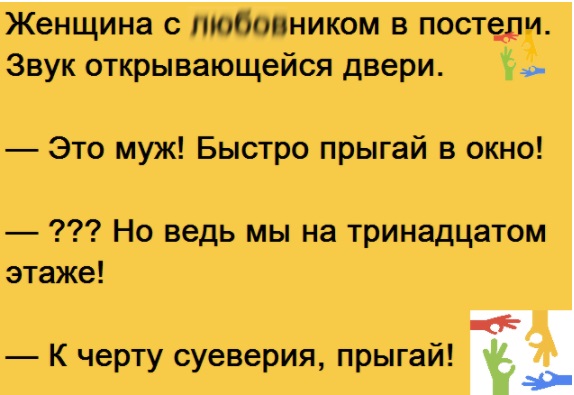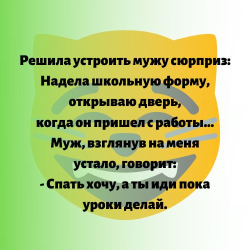 В такой особенный день как пятница, и анекдоты нужны необычные. Такие, чтобы всего двумя строчками или репликами смогли не просто улыбнуть, но даже рассмешить. Такие анекдоты дорогого стоят, ведь их не так уж и много. Но мы в постоянных поисках, и время от времени всё же попадается кое-что интересное. В таких случаях мы с удовольствием делимся позитивом с вами.