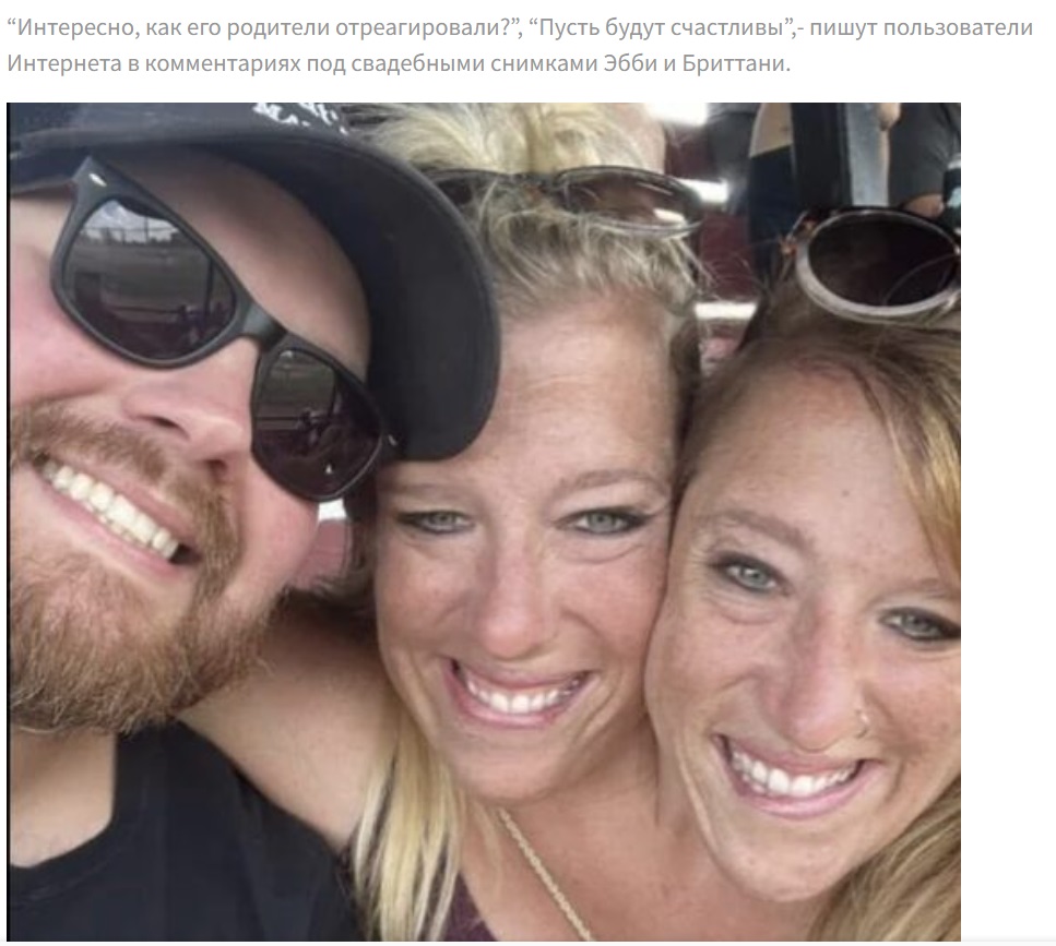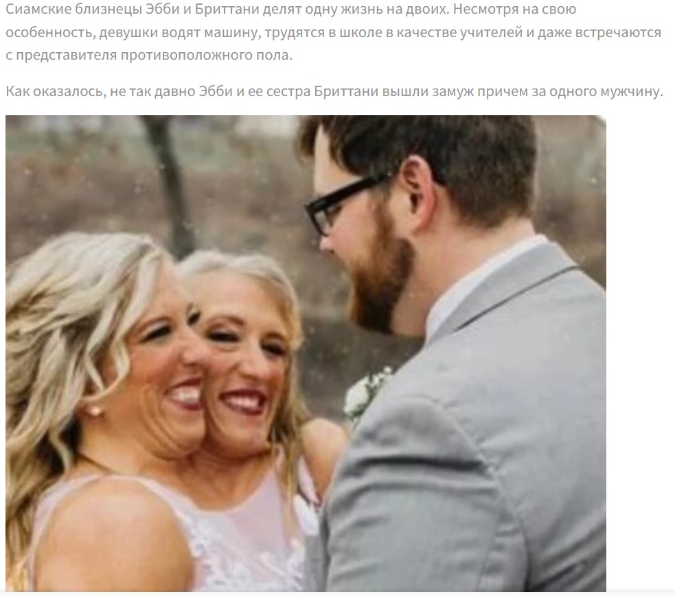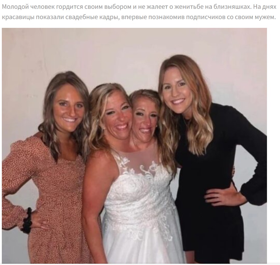 Настоящая любовь не знает границ и стандартов. Сиамским близняшкам Эбби и Бриттани удалось почувствовать это на собственном опыте. Так, недавно они опубликовали на своей странице в соцсетях снимки с собственной свадьбы. На каждом фото красуются счастливые девушки и… их общий супруг!
