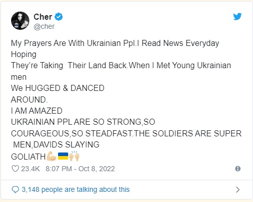 Свою поддержку Украине в очередной раз высказала известная американская певица Шер. Так, 8 октября в своем Twitter-аккаунте она опубликовала новый пост, в котором назвала украинских защитников суперменами, а самих жителей Украины — невероятно отважными и стойкими людьми.