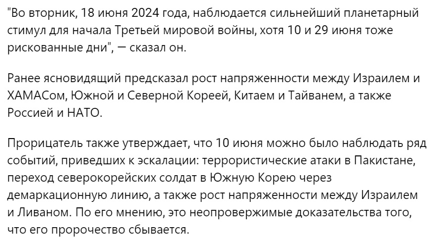 Многие авторитетные предсказатели в один голос твердят — как, как раньше уже не будет, и изменения коснутся всей планеты. Некоторые из ясновидящих не берутся говорит, какими именно будут эти изменения, другие — решительно предсказывают Третью мировую. В числе последних — индийский Нострадамус Кушал Кумар. Он не просто утверждает, что большой мировой конфликт близко, он даже называет вполне реальную дату, которая настанет уже буквально через несколько дней. Вторник, 18 июня — день начала Третьей мировой, по прогнозам индийского прорицателя…