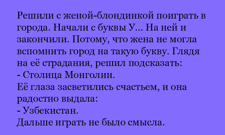 Все блондинки-глупышки этого мира возмущаются бесконечному количеству анекдотов о не слишком умных дамах со светлыми волосами. А вот светловолосые умные леди не возмущаются — ведь они знают, что это точно не о них. Мы же предлагаем никому и никогда не обижаться на анекдоты — ведь это всего лишь повод посмеяться, а принимать на свой счет никогда ничего не надо.