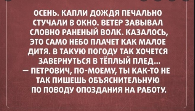 Доброго всем осеннего утречка! За окошком светит солнышко, воздух теплый, но при этом свежий и, кажется, абсолютно все на этом свете располагает к прекрасному приятному и удачному дню. И для того, чтоб именно таким он и был, предлагаем Вам подзарядиться энергией юмора и позитива, и с самыми положительными эмоциями отправляться на встречу новым событиям и свершениям.