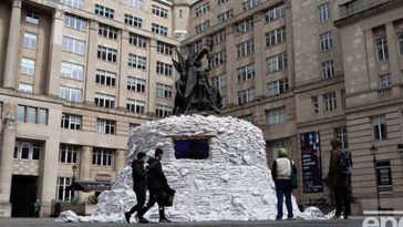 В поддержку украинцев памятник Нельсону в Ливерпуле обложили мешками с песком. Фото