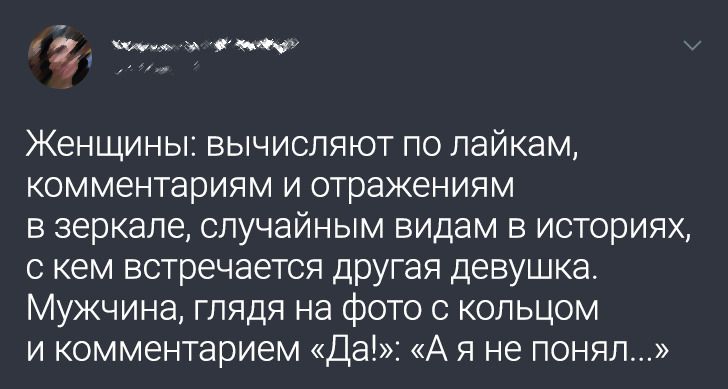 Несколько дней назад мужу понадобилось отправить сообщение с моего компа. Отправил и начал возмущаться тем, какая древняя у меня клавиатура, как неудобно печатать… И тут его осенило! Поворачивается ко мне и с полными гордости глазами говорит: «Я придумал, что подарю тебе на 8 Марта — новую клавиатуру!» © madbirdy / Pikabu
