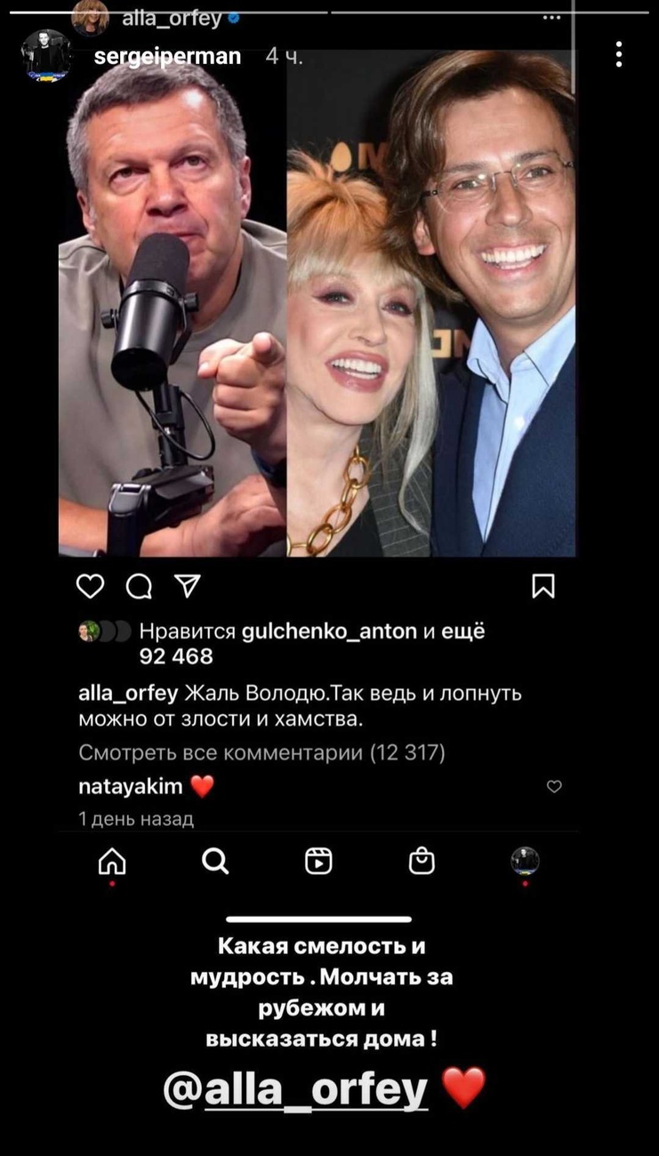 Так, продюсер отреагировал на пост артистки, сделанный сразу после её возращения в рф. В своей публикации Алла Борисовна упомянула российского путuнuста-пропагандиста Соловьева. В тексте она отметила, что тот может лопнуть от злости и хамства.