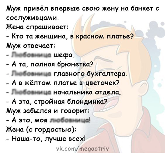 И не только серьезные аспекты, но и юмор про отношения между полами — излюбленная тема и для разговоров, и для шуточек.
