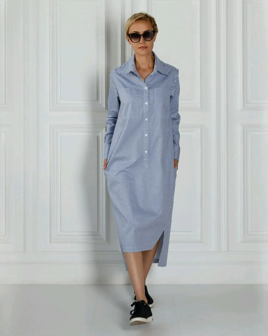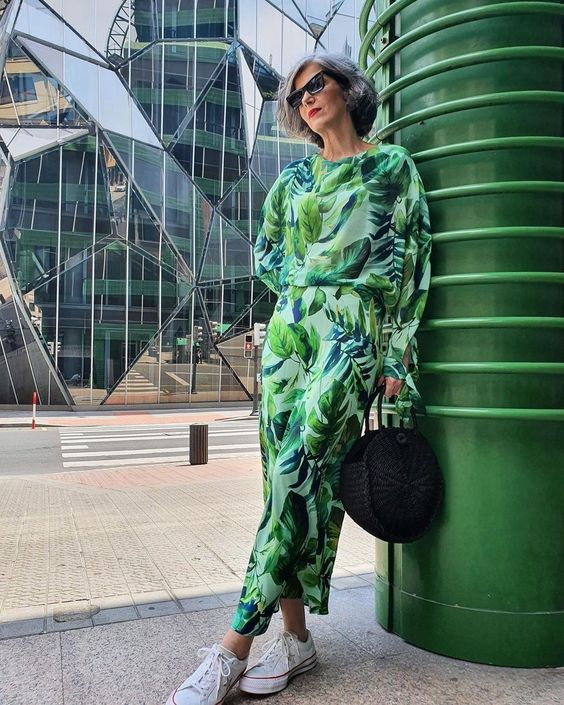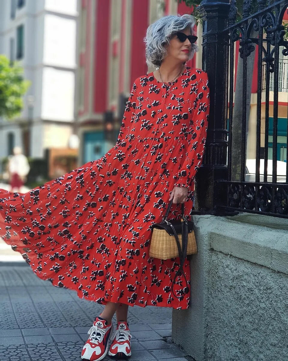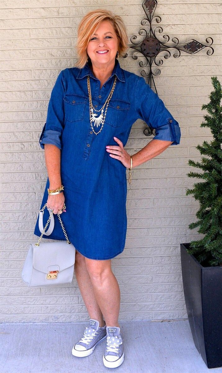 Беспроигрышное сочетание – кроссовки и платье-рубашка. Дамам в возрасте 50+ подойдут платья длины миди. Можно выбрать однотонную модель или платье с геометрическим принтом. При невысоком росте идеальный выбор – платье из ткани в вертикальную полоску. Спортивная обувь без каблука делает фигуру приземистой, а вертикальная полоска на ткани будет нивелировать этот эффект, визуально вытягивая силуэт.