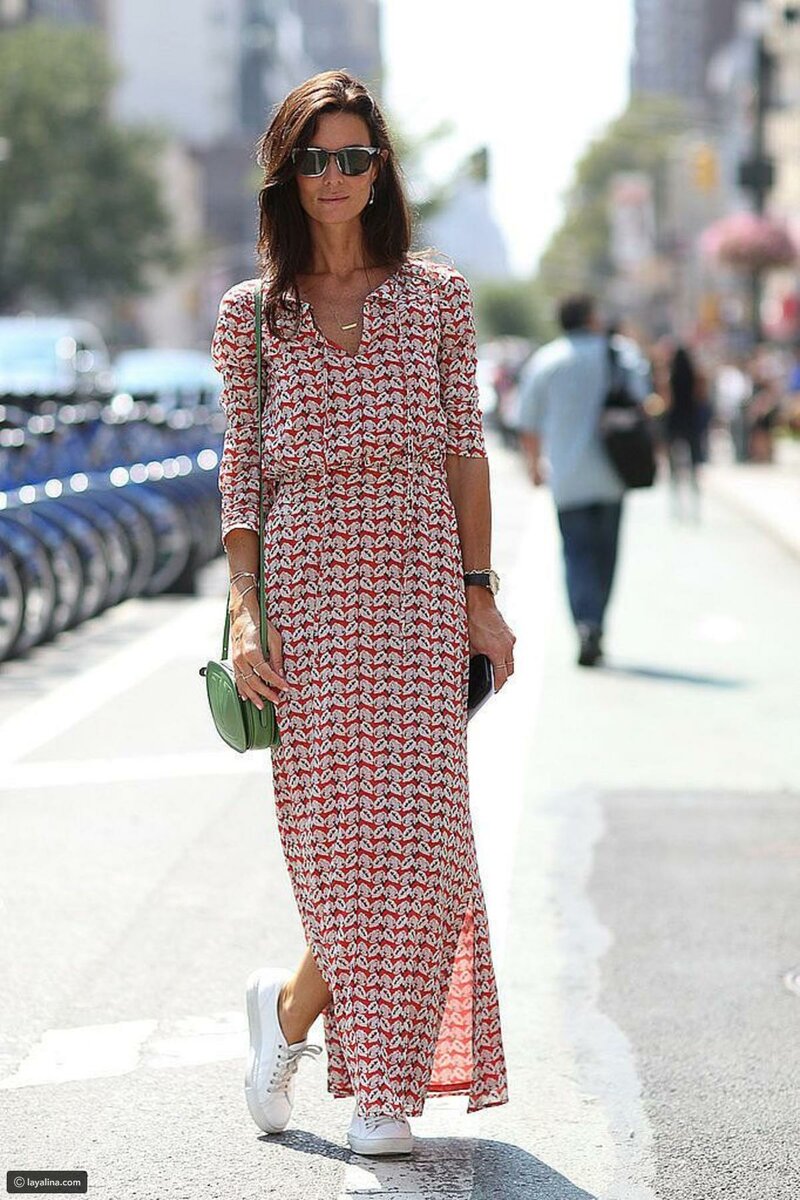 Хорошо смотрятся белые кроссовки с платьями макси. Модель прямого силуэта с разрезами в боковых швах и акцентом на талии визуально вытягивает и стройнит.