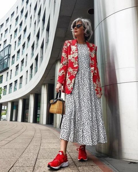Свободное платье силуэта трапеция – модель, которая будет хорошо смотреться и на стройной, и на полной фигуре. Платье из легкой ткани красного цвета с черным цветочным принтом отлично смотрится с красно-белыми кроссовками.