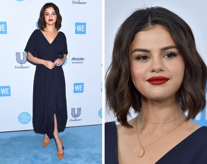 В апреле 2018 года Селена Гомес появилась на мероприятии WE Day California в сдержанном синем платье.