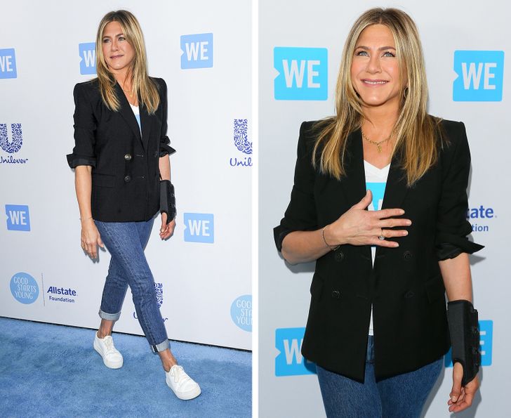 Дженнифер Энистон в апреле впервые после объявления о разводе вышла в свет. Но выбрала она для этого не платье, а джинсы и черный блейзер. Впрочем, выглядела она, как всегда, сногсшибательно.